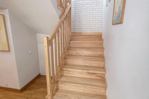 Na podłogach wysokiej jakości drewniany parkiet (parter dąb, poddasze jesion), w łazienkach nowoczesna glazura i terakota, schody drewniane.