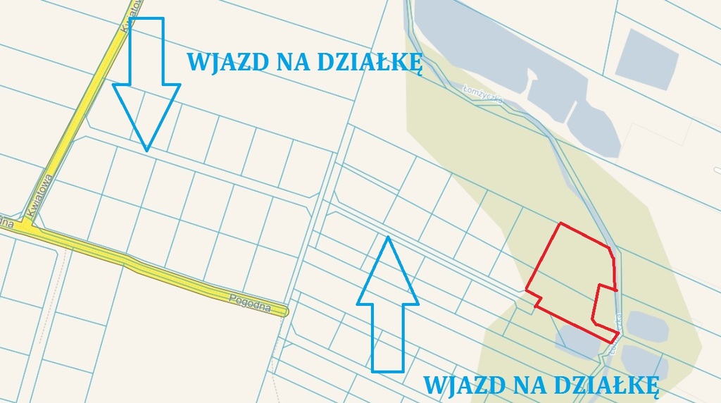Cicha, spokojna okolica. Idealne miejsce do zamieszkania. Dojazd do działki stanowi droga o nawierzchni polnej.
